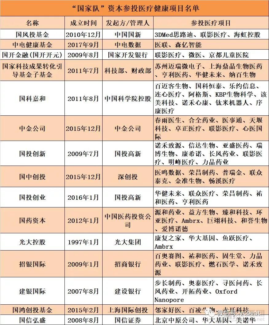 据不完全统计,近年共有15家“国家队”投资机构/基金参与医疗领域投资,涉及近70个项目。