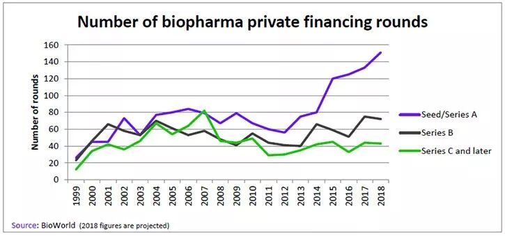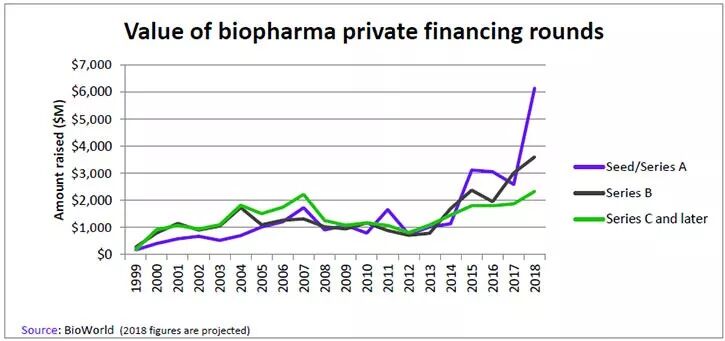 2018年才仅仅过去了五个月,而投资者在生物治疗企业上投入的种子基金和A轮融资已经超过了去年的全年总额。按照这样的速度,预计到2018年底,融资总额可能会从目前的26亿美元增至60亿美元以上——与历史上两个峰值年(2015年和2016年)相比,均超过一倍多。