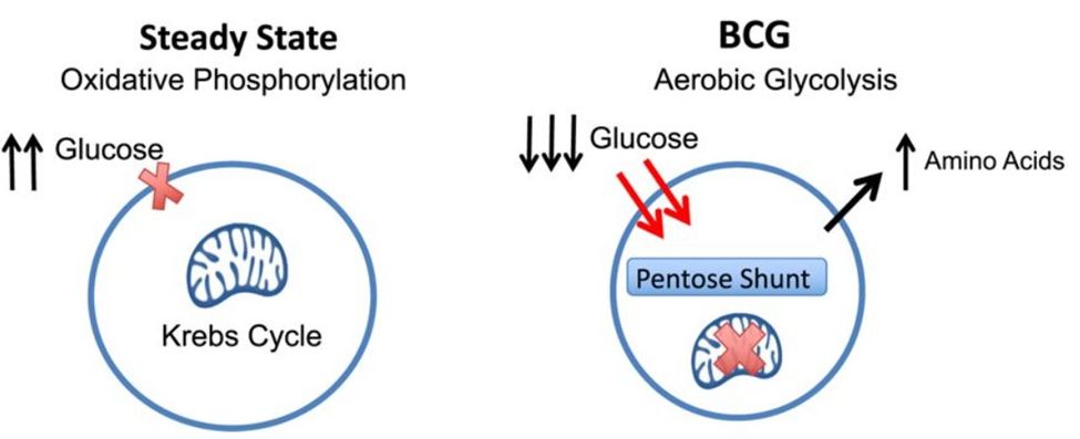 Faustman及其团队观察到卡介苗给药将葡萄糖代谢从氧化磷酸化转变为细胞消耗量更大的有氧糖酵解过程。该假设认为卡介苗会引起下调三羧酸循环,加速有氧糖酵解,同时增加葡萄糖摄取,分流葡萄糖至磷酸戊糖旁路以增强嘌呤的生物合成。研究期间从患者收集的DNA和RNA证明了这一点。氧化磷酸化是细胞将葡萄糖转化为能量的最常见方式,而有氧糖酵解则消耗更大量的葡萄糖。Faustman博士解释道:“当转到有氧糖酵解模式,像白细胞这样的细胞会消耗10-20倍的糖。”