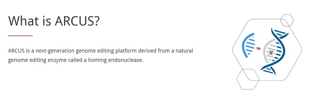 Precision BioSciences公司的ARCUS技术是基于一种该公司独创的完全通过人工合成的ARC核酸酶。ARC核酸酶与归巢核酸内切酶有非常类似的特性,它不但具备非常高的特异性,而且可以被定制识别任何靶点基因内的DNA序列。ARC核酸酶的另一个优势是它由310个氨基酸组成,是一个很小的多肽链,因此很容易被多种载体运送到细胞内。而且ARC核酸酶不需要其它部件辅助,本身就能够完成序列识别和DNA切割的过程。