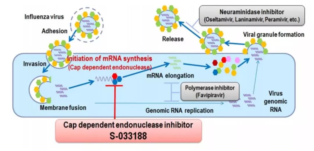 Baloxavir marboxil最初是由日本塩野义制药(Shionogi & Co)开发的抗病毒新药,它通过抑制流感病毒中的cap-依赖型核酸内切酶(cap-dependent endonuclease),起到抑制病毒复制的作用。已有抗流感药物的作用机制都是通过靶向神经氨酸酶来防止病毒在体内传播。与这些药物相比,baloxavir marboxil靶向病毒复制周期的更早阶段,而且它能够对已经对奥司他韦产生抗性的流感病毒产生疗效。