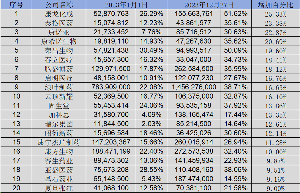 在全面复盘了百余家港股通医药标的后,我们整理出了2023年港股通南向资金持股占比提升速度最快的20家医药公司。