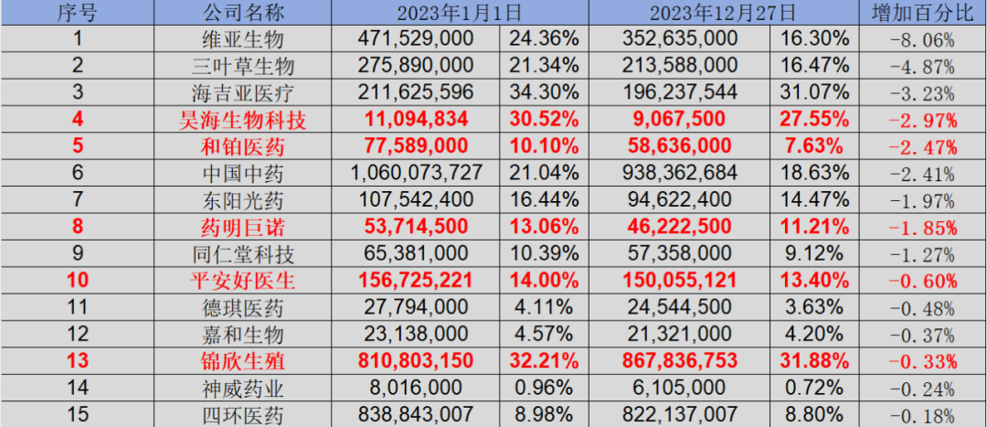 图:内资持股比例下降最多的15家医药公司,来源:锦缎研究院