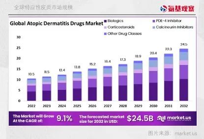 据market us一份报告预测,到2032年,全球特应性皮炎治疗市场预计将达到245亿美元。很显然,这是兵家必争之地。