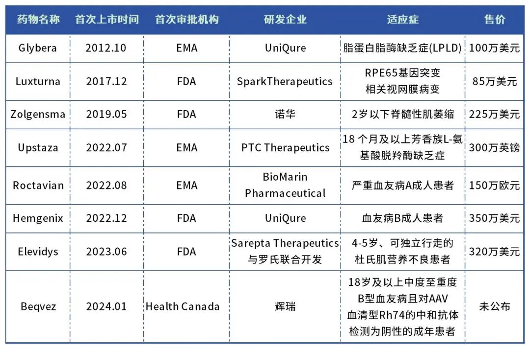 AAV:CGT的高频载体 AAV是一种无包膜单链DNA病毒,由蛋白衣壳(capside)和长度为4.7kb的单链DNA基因组构成,而蛋白衣壳又由VP1,VP2,和VP3三个亚基组成,最早于1965年首次在实验室的腺病毒制剂中被发现。 在经历了长达20多年的基础理论研究之后,AAV载体的神秘面纱逐渐被揭开,并于1995年首次用于治疗人类的囊性纤维化病,21世纪后,越来越多的AAV血清型(AAV1、AAV2、AAV3、AAV4、AAV5、AAV6、AAV7、AAV8、AAV9)被发现。 不同的AAV血清型具有不同的衣壳蛋白以及特殊的空间结构,AAV的免疫原性和组织靶向性都取决于AAV亚型或血清型,AAV2是发现最早且最常使用的AAV血清型,AAV9紧随其后,不同的AAV血清型对组织的靶向性不同,其中AAV8主要靶向肝脏,AAV9主要靶向心脏,AAV1、AAV6和AAV7主要靶向骨骼肌。 目前基因疗法使用的病毒载体包括AAV、腺病毒、逆转录病毒、慢病毒、疱疹病毒,AAV基因疗法具有安全性高、长效性、宿主范围广、不整合宿主基因组等优势,一旦进入细胞后,它可以引导细胞制造(表达)某种特定的蛋白质,与其他来源的病毒载体相比,当用于向具有免疫活性的细胞(例如某些免疫系统的细胞)引入特定基因时,AAV载体的效果更为显著。 根据Cortellis 2022年数据,共1563人使用病毒和质粒载体,其中824个AAV载体在研和已上市药物,203个腺病毒载体在研和已上市药物,106人逆转录病毒,54个慢病毒,24人疱疹病毒,87人质粒,其余为unspecified。可以看出AAV载体为目前基因疗法开发利用的载体序列里最高频使用的一个载体,显著高于第二高频使用的腺病毒载体。 天价难卖,巨头依旧“热追” 基于AAV作为基因治疗载体的优势,近年来,AVV疗法的应用领域不断拓展、治疗效果的不断提升、治疗方案的不断创新,发展势头迅猛,相关药剂分别于2012年和2017年获EMA和FDA首批,截至目前,全球已上市的AAV基因疗法有7款,均针对罕见病。 根据Cortellis2022数据,目前在研针对眼科疾病的AAV疗法有152个,252款针对神经类疾病,170款针对代谢类疾病,其余65款针对骨骼肌,46款针对血液疾病,神经、眼科、代谢为重点布局领域。 已上市 AAV疗法 图片来源:根据药智数据整理 第一款上市的AAV基因疗法为荷兰UniQure的Glybera,于2012年获得EMA批准,用于治疗脂蛋白脂肪酶缺乏症,2014年Glybera正式上市开售。但由于其效果有限、定价太高(平均一次疗法100万美元)且适应症太过罕见(发病率1/100万),上市至今仅有一位患者接受治疗,Glybera在2017年4月黯然退市。 2022年,AAV疗法迎来上市高峰,接连3款药物(Upstaza、Roctavian、Hemgenix)获批上市,其中,2022年11月,FDA批准Hemgenix上市,用于治疗B型血友病成人患者,定价350万美元,再一次刷新基因疗法的价格纪录,也是目前全球最贵的药物,基于优异的临床数据,Hemgenix于2023年2月和3月分别获得欧盟委员会和英国药监机构MHRA批准。 销售方面,2023年6月刚上市的Elevidys,根据Sarepta Therapeutics公布相关信息,2023年Elevidys销售额达2.004亿美元(约14.37亿元),远超预期,按定价每剂320万美元来计算,大概销售剂量为63剂。 不过其他几款AAV疗法,由于商业策略原因和价格问题,2023年销售额并不理想。2023年6月,CSL Behring和uniQure宣布首名患者接受了B型血友病基因疗法Hemgenix治疗,这是Hemgenix上市半年才完成商业化首单,目前也尚未实现大范围推广。 Skysona在2022年9月获美国FDA批准上市,定价为300万美元,2023年前三季度销售额1086万美元,按售价来计算,仅有3~4名患者接受治疗;Zynteglo2022年8月获美国FDA批准上市,定价280万美元,2023年前三季度销售额867.8万美元,仅有3~4名患者接受治疗。 整体来讲,目前的AAV基因疗法定价都在百万美元以上,已上市产品的市场开拓面临诸多挑战,但是AAV在罕见病领域展现出的良好应用前景,依旧吸引了一大批药企入局,尤其2022年开始,针对AAV领域的BD此起彼伏,交易数量超10起,总交易金额超过150亿美元,辉瑞、罗氏、诺华、安斯泰来、艾伯维等在内的大型跨国药企均布局了AAV基因疗法。 近两年AAV领域主要BD合作 图片来源:公开信息整理