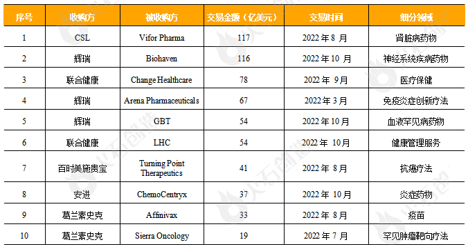 2022年,全球医药健康领域并购交易活动持续活跃。从并购领域看,头部企业重点加大在肾脏病药物、神经系统疾病药物、炎症药物、罕见病药物、疫苗以及健康管理服务等领域的布局,以进一步增强其研发管线、投资研发以及即将上市的重磅产品。从投资阶段看,投资重心逐渐转向优质的后期资产和在早期便能实现医疗突破的新技术。从并购规模看,全球TOP10并购事件总额达616亿美元,其中,澳大利亚血制品和疫苗龙头企业CSL以117美元收购Vifor Pharma成为本年最大金额并购事件,辉瑞、联合健康和葛兰素史克等三大巨头占据Top10并购事件的7成。
